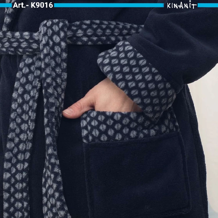 Bata hombre KinaNit KN9016C otoño-invierno CoralinaModelo corto con cuello tapeta con cinturón, bolsillos en los laterales y el pecho y estampado en el cuello, puño y cinturón.Presentación en Presentación en Percha Talla: M, G y SGColor: ÚnicoComposición: Coralina