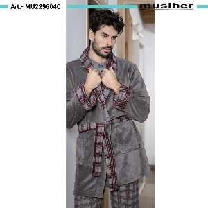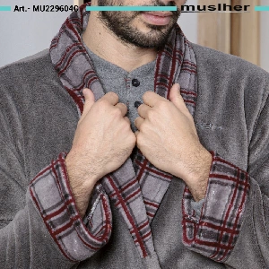 Bata hombre Muslher 229604C Otoño-invierno coralinaModelo largo con cinturón y cuello smoking, bolsillos en los laterales y estampado en puño, cuello y cinturón.Presentación: caja individual de la marca con ventana.Color: ÚnicoTallas: S, M, L, XL y XXLComposición: 100% poliéster