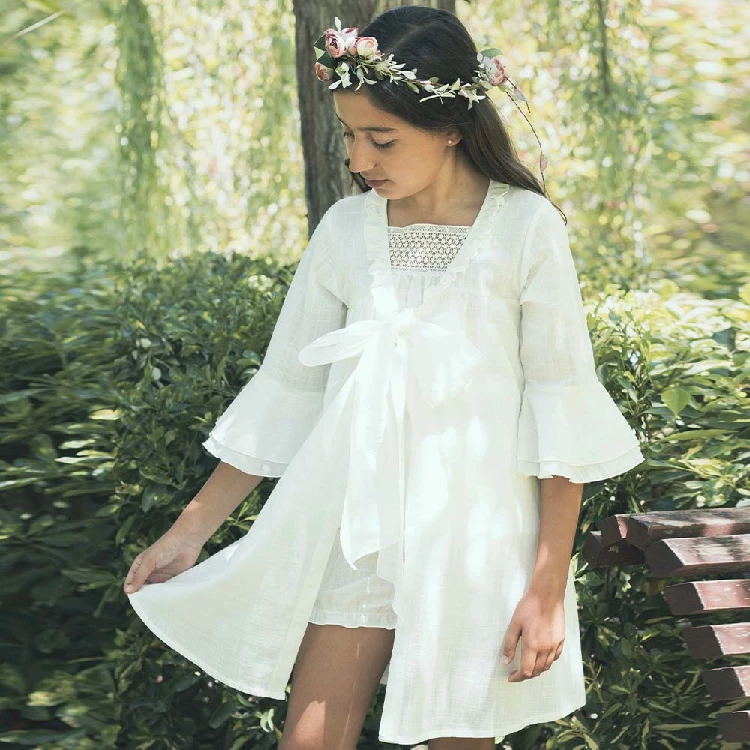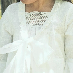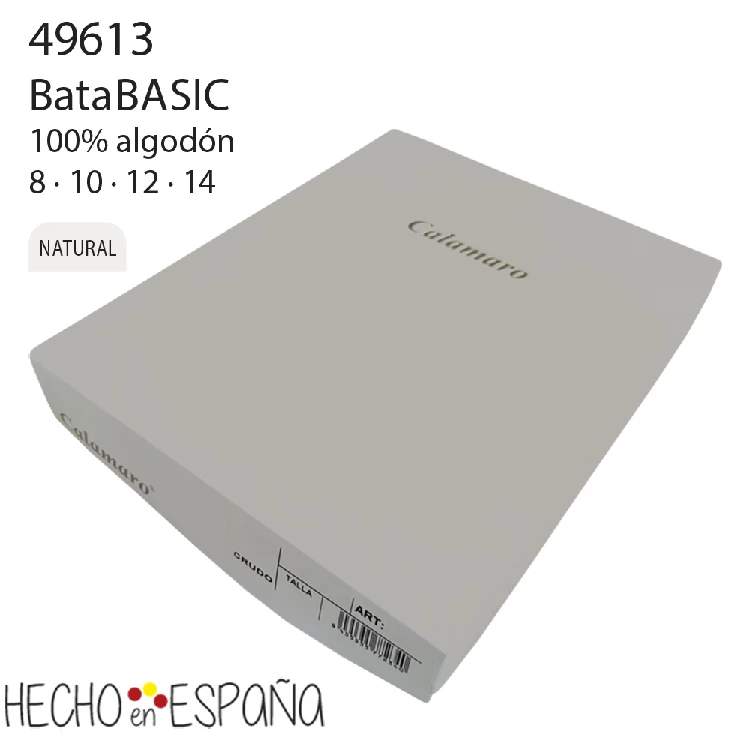Bata infantil niña Calamaro 49613 ComuniónModelo básico por encima de las rodillas.Tiene el cuello y el puño de la manga con volante. Se ata con lazada grande.Fabricado en España.Presentación: Pack individualColor: NaturalTallas: 8, 10, 12 y 14Composición: 100% AlgodónCombinan: C49613, C49619 y C49618