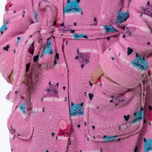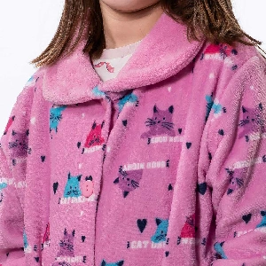 Bata infantil niña KinaNit 8131Modelo anudado a la cintura, con botones, estampado completo y cuello tapeta.Bolsillos en los lateralesPresentación: Caja individualColor: ÚnicoTallas: 8, 10, 12, 14 y 16Composición: