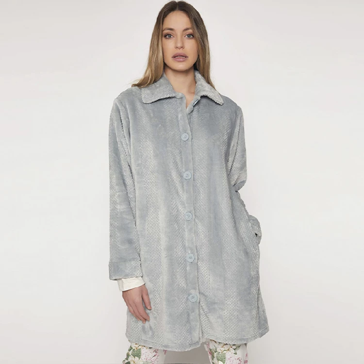 Bata mujer Admas ADM57414 Modelo largo con botones, bolsillos y detalles bordados.Presentación: Caja de la marcaColor: Piedra, aqua, rosa y azulTallas: S, M, L, XL, XXL y 3XLComposición: 100% poliéster