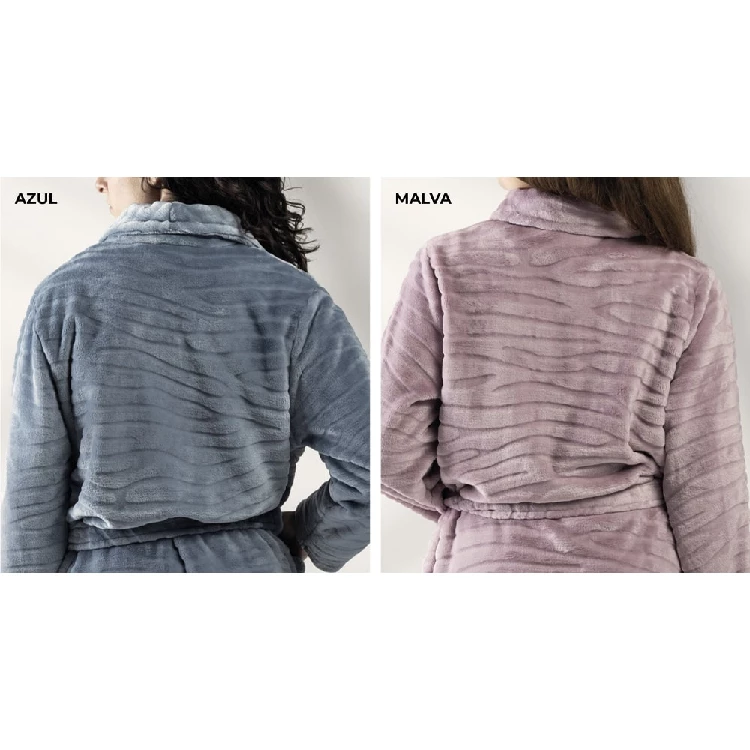 Bata mujer Lin 1021 Corta CoralinaModelo corto por arriba de las rodillas, cuello tapeta y relieve.La bata esta anudada a la cintura, con botones y bolsillos en los laterales.Presentación: Caja individualColor: Malva y AzulTallas: S, M, L, XL, XXL, 3XL, 4XL y 5XLComposición: 100% poliéster, Coralina