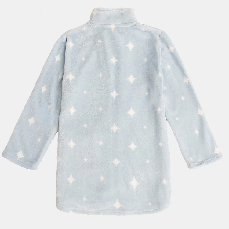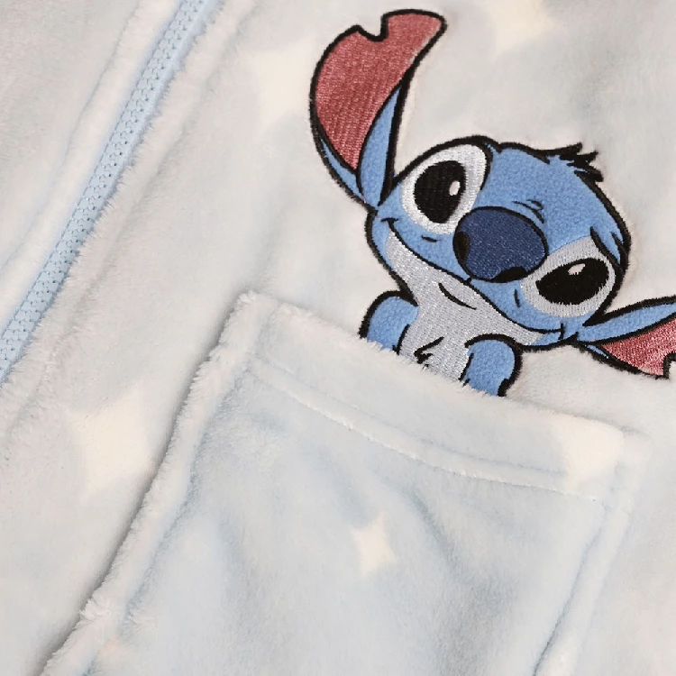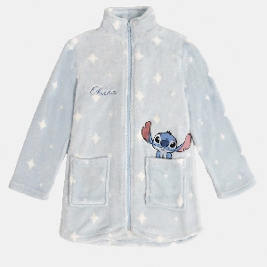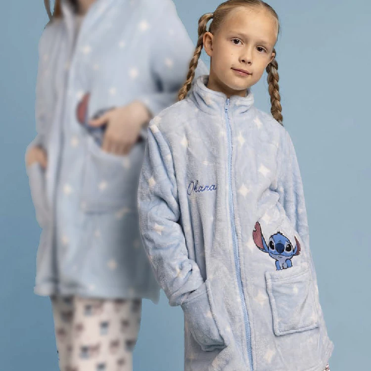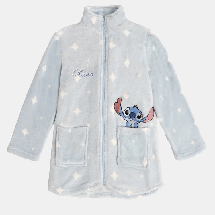 Bata niña Ohana 67142 Tejido calentito de coralina Bata de niña color azul con estrellitas blancasDetalles bordados Stitch y OhanaBolsillos lateralesColor: Azul Tallas: 4, 6, 8, 10, 12, 14, y 16 Composición: 100% poliéster