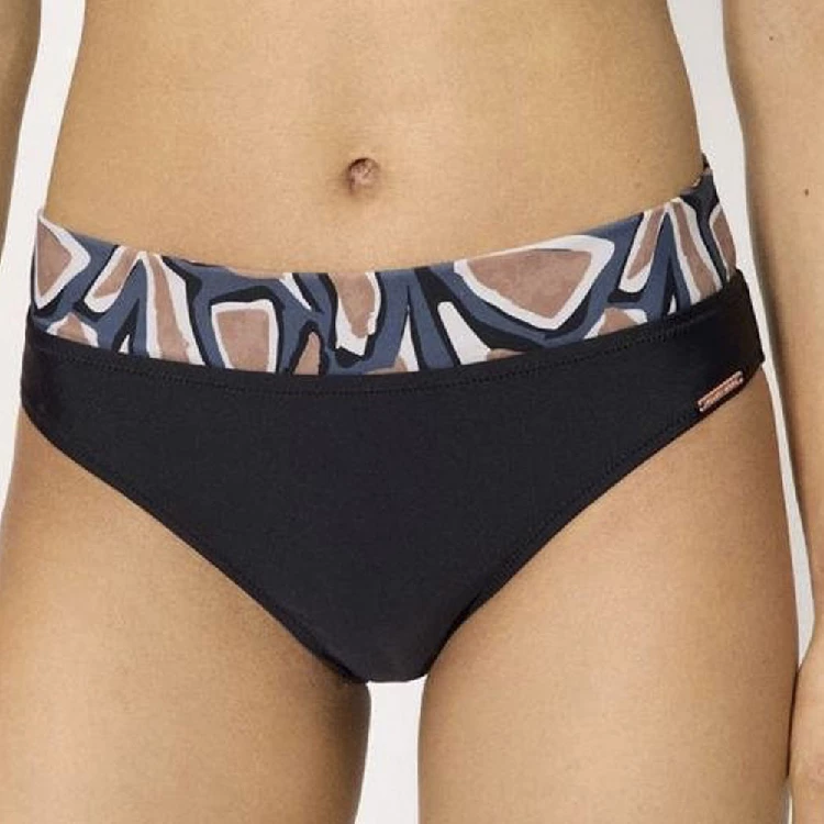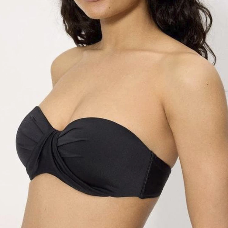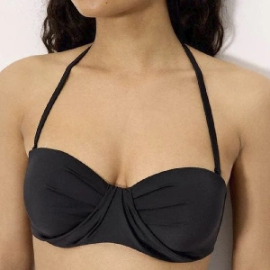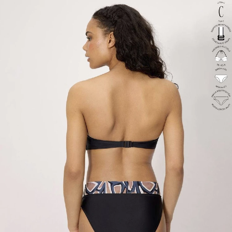 Bikini mujer Ysabel Mora 83302_1 Copa C BandeauSujetador en copa C, con aro y relleno, con tirantes desmontables y anudado al cuello. Modelo Bandeau.Braga midi estampada y multiposiciones.Presentación: Caja individualColor: NegroTallas: 90, 95, 100 y 105Composición: 82% Poliamida y 18% elastano