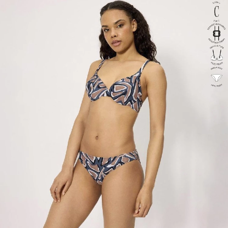 Bikini mujer Ysabel Mora 83304_1 Copa C Aro con rellenoSujetador en copa C, con aro y relleno, estampado completo y con tirantes regulables y fijos.Braga mini estampada completa.Presentación: Caja individualColor: ÚnicoTallas: 90, 95, 100, 105 y 110Composición: 82% Poliamida y 18% elastano