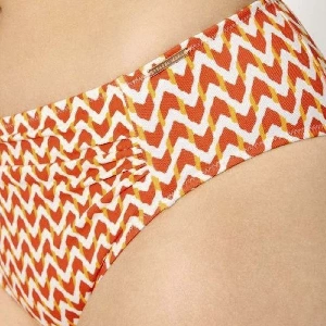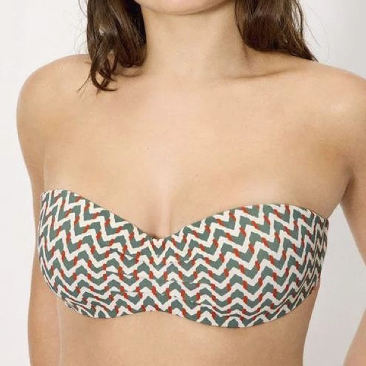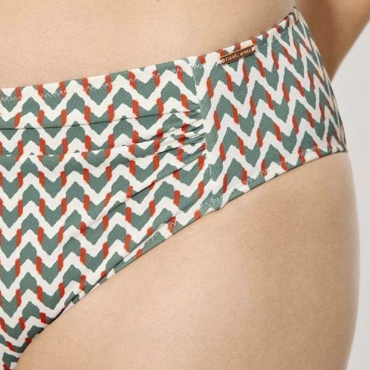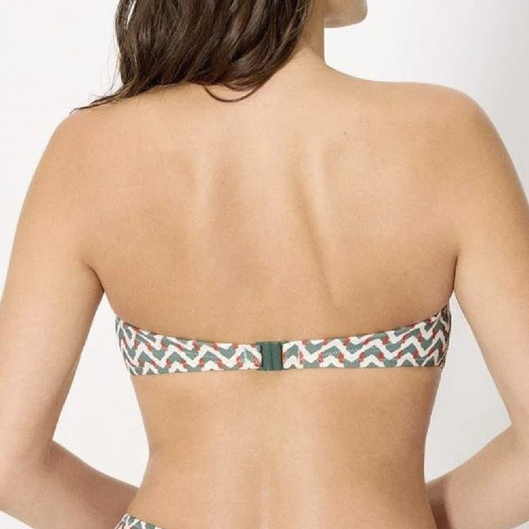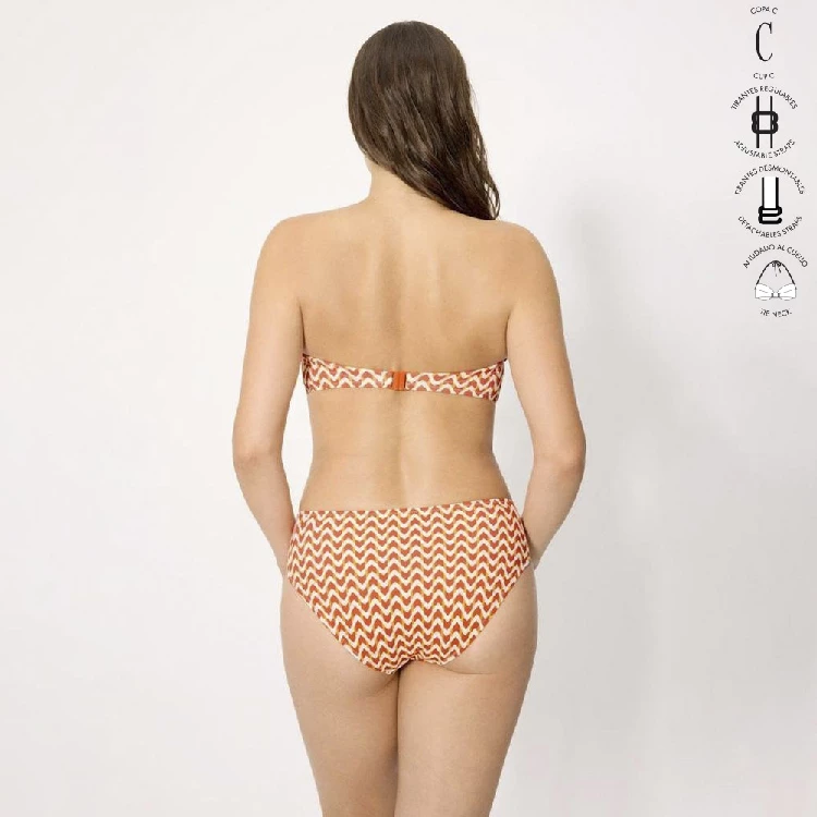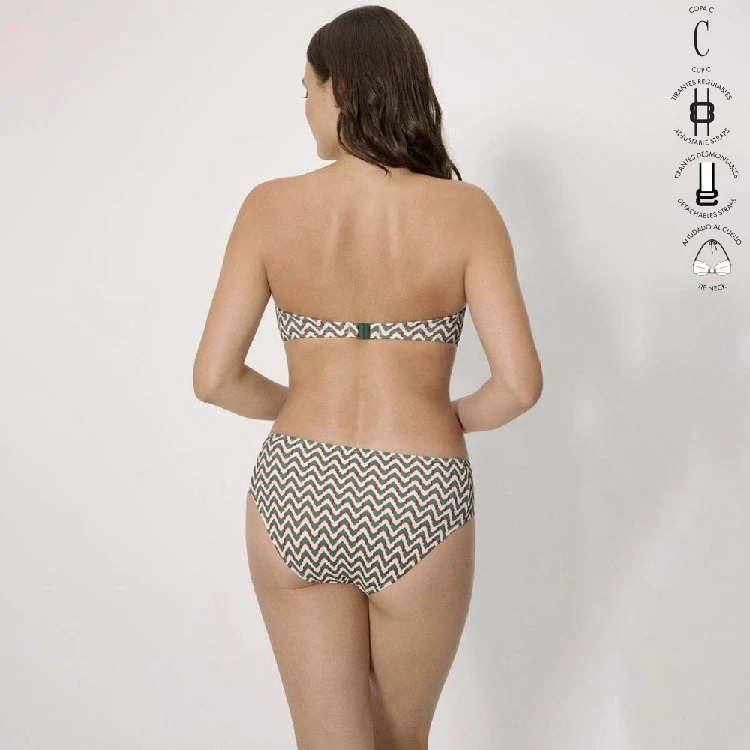 Bikini mujer Ysabel Mora 83324_1 Copa C BandeauSujetador en copa C, bandeau, con aro y con relleno, estampado completo, tirantes regulables, desmontables y anudados al cuello.Braga bikini mini estampada completa.Presentación: Caja individualColor: Ikat Coral y Ikat GreenTallas: 90, 95, 100 y 105Composición: 90% Poliamida y 10% elastano
