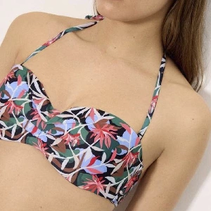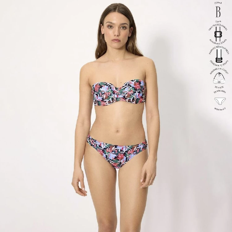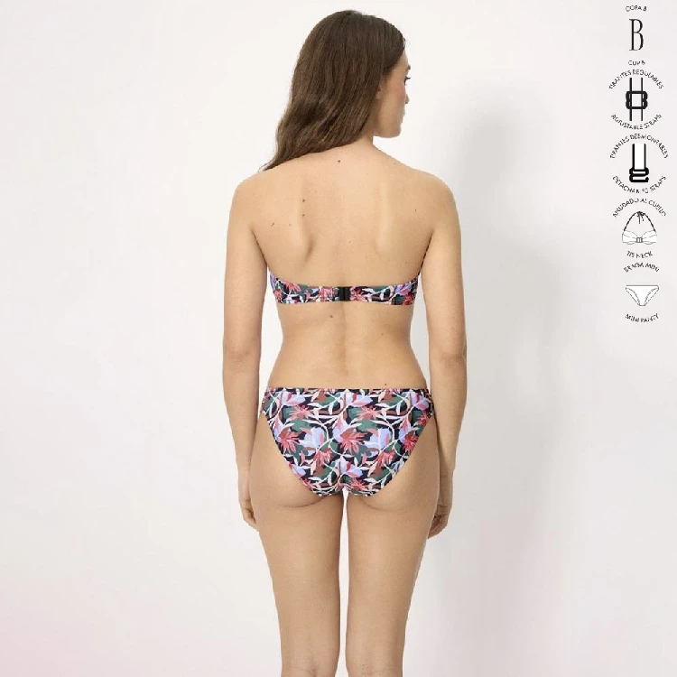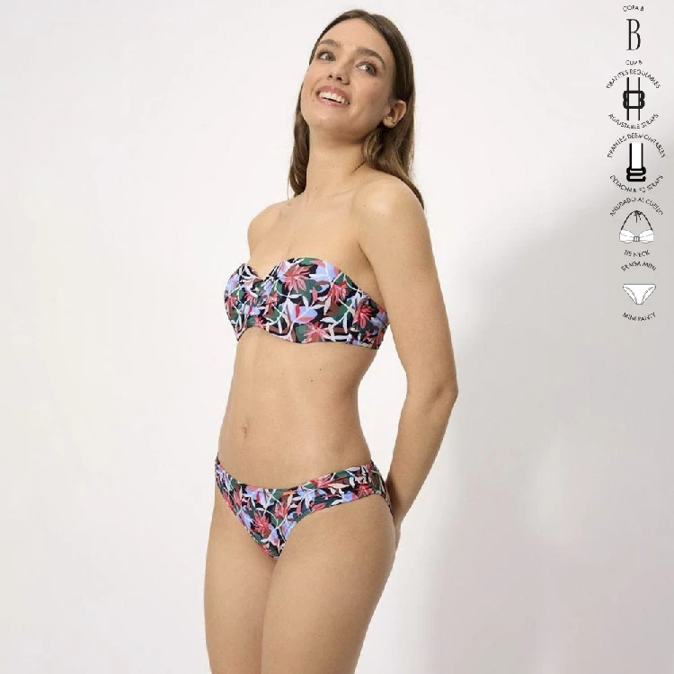 Bikini mujer Ysabel Mora 83340 Copa B BandeauSujetador en copa B. bandeau con aro y con relleno, tirantes regulables, desmontables y anudado al cuello. Estampado completo.Braga mini estampada completa.Presentación: Caja individualColor: ÚnicoTallas: 85, 90, 95, 100 y 105Composición: 84% Poliamida y 16% elastano