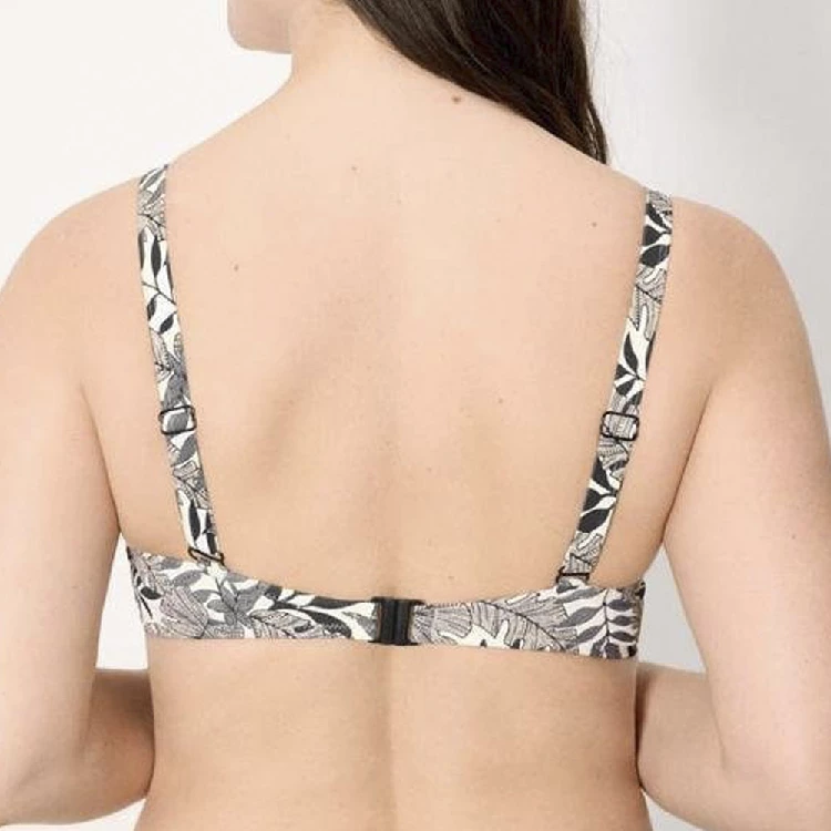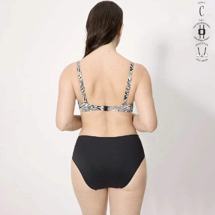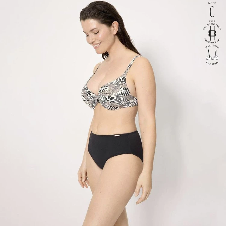 Bikini mujer Ysabel Mora 83346_1 Copa C Aro con rellenoSujetador en copa C, con aro y con relleno, tirantes regulables y fijos con estampado completo.Braga maxi reductora básica.Presentación: Caja individualColor: Black PalmTallas: 90, 95, 100, 105 y 110Composición: 90% Poliamida y 10% elastano