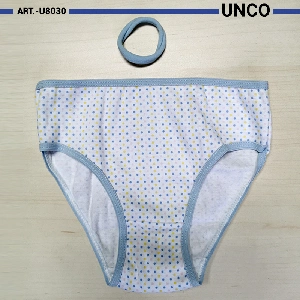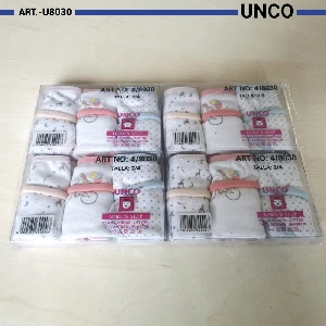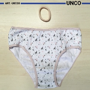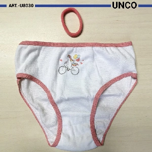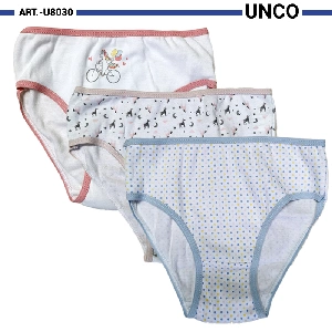 Braga infantil niña Unco U8030 (12 Unidades)Modelo de algodón adaptable estampadoBraguita + coleteroPresentación: Pack de 3 unidades, 4 packs por bolsaColor: SurtidoTalla. 2/4, 6/8, 10/12, 14/16Composición: 95% algodón 5% elastán