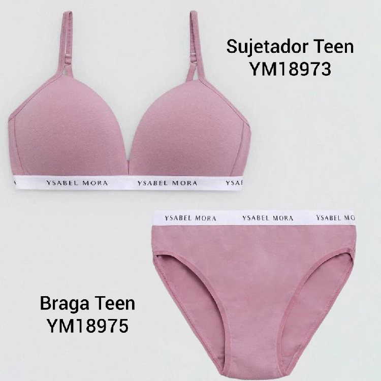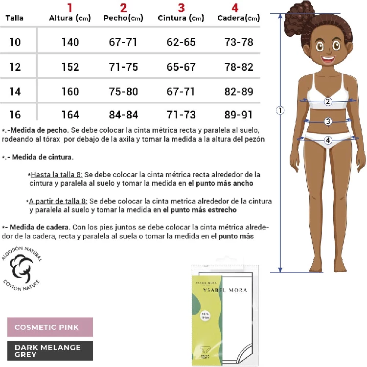 Braga infantil niña Ysabel Mora 18975Modelo básico hecho de algodón natural y con el bordado de la marca en la tira.Presentación: Caja individualColor: Cosmetic pink y Dark Melange GreyTallas: 10, 12, 14 y 16Composición: 95% Algodón y 5% ElastanoCombinan: 18973 y 18975