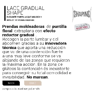 Braga maxi mujer Janira 1030726Modelo maxi de Janira. Prenda moldeadora de puntilla floral extraplana con efecto reductor gradual. Recogen la parte lumbar y del abdomen gracias a su innovadora técnica que aporta una reducción que va de una contención fuerte a una muy leve conforme se va alejando de las zonas que requieren la máxima acción.En la zona de glúteos la contención es inexistente para conseguir su total comodidad e invisibilidad. No marcanColección: Lace gradual ShapePresentación: Caja individual de la marcaColor: negro y duneTallas: M, L y XLComposición: