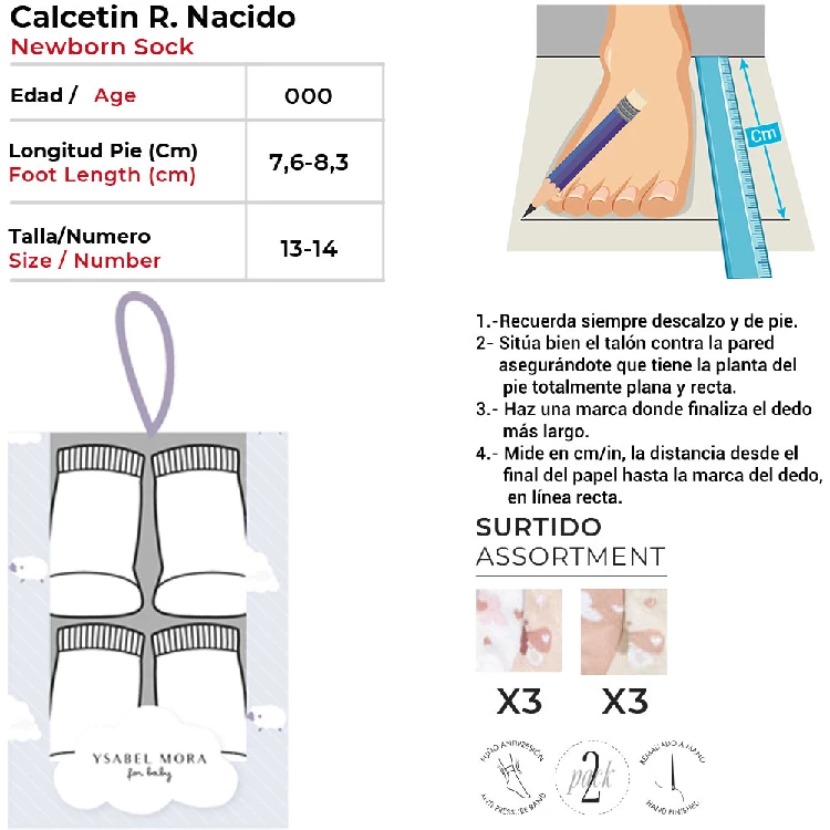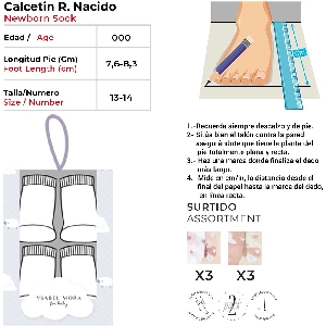 Calcetín bebe Ysabel Mora 62823 Pack de 6 bipacks Recién nacidoModelo para bebé recién nacido estampado con tonos suaves.Con puño antipresión y remallado a mano.Presentación: Caja de 6 packs de 2Color: SurtidoTallas: 000 (13-14)Composición: 73% Algodón, 25% Poliamida y 2% Elastano