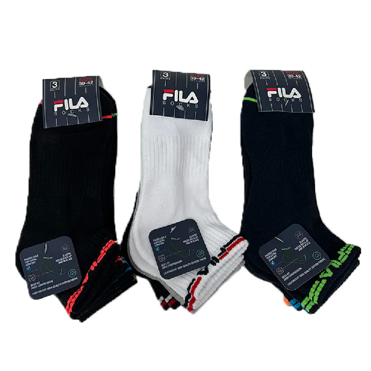 Calcetín hombre Fila F2523 Pack de 3 DeportivoModelo tobillero deportivo con rizo.Tiene una suela acolchada que proporciona absorción de impactos.La estructura acanalada brinda soporte al tobillo.Cuenta con soporte para el arcoHecho con material de algodón suave y cómodoPresentación: Pack de 3 calcetines con colgadorColor: Gris/Negro, Gris/Negro/Azul, Color Sport, blanco y Fashion blackTallas: 35/38, 39/42 y 43/46Composición: 69% algodón, 29% poliéster y 2% elastano
