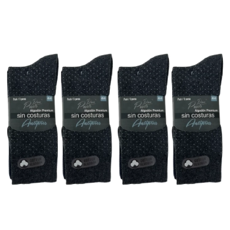 Calcetín hombre Posets 371 Pack de 12Modelo largo sin costuras, puño antipresión y estampado.Hecho de algodón Premium.Presentación: Bolsa de 12 unidades, 4 packs de 3 unidadesColor: SurtidoTallas: 40/45Composición: 80% Algodón, 18% Poliéster y 2% elastanoCUIDADOS:Lavar a 30ºNo utilizar blanqueantesNo utilizar secadoraNo plancharNo lavar en seco