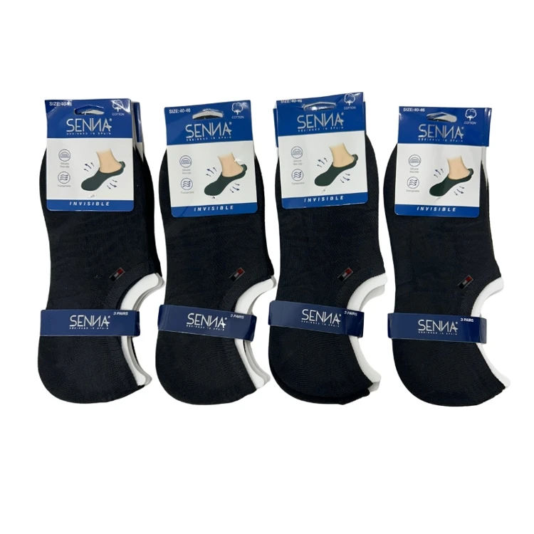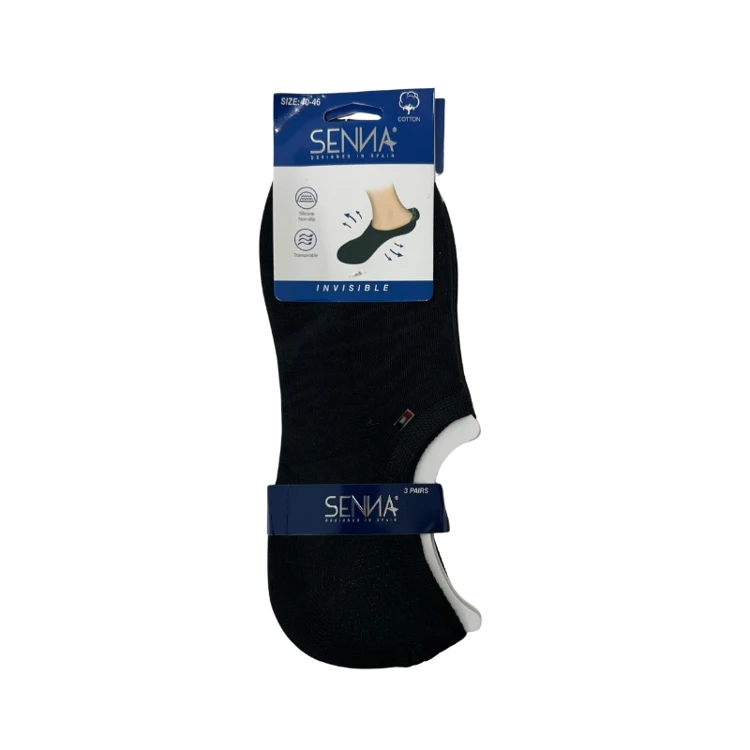 Calcetín hombre Senna SN1103 Pack de 12 PinkyModelo pinky hecho de algodón transpirable y con talón de silicona.Presentacion: Bolsa de 12 unidades individualesColor: Blanco, Arena, Negro y SurtidoTallas: 40-46Composición: 90% Algodón, 5% Poliéster y 5% Elastano