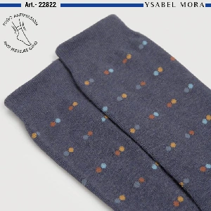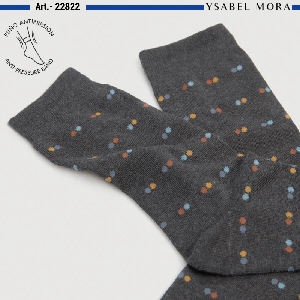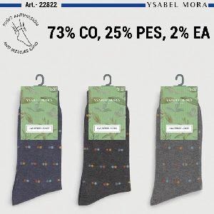 Calcetín hombre Ysabel Mora 22822 Caja de 12 unidadesModelo estampado de hombre. Motivos circulares sobre bases lisas. Tejidos en algodón y con puño antipresión.Presentación: Caja de 12 unidadesColores: surtidoTallas: 41-46Composición: 73% Algodón, 25% Poliéster, 2% Elastano