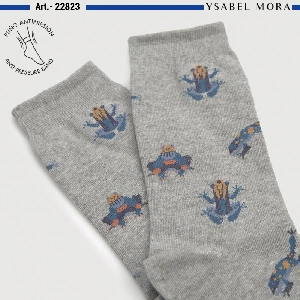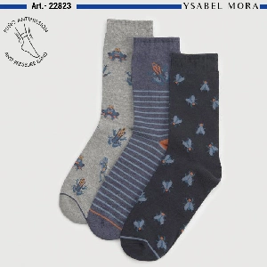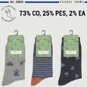 Calcetín hombre Ysabel Mora 22823 Caja de 12 unidadesModelo estampado de hombre. Diseños de insectos sobre bases lisas. Tejidos en algodón y con puño antipresión.Presentación: Caja de 12 unidadesColores: surtidoTallas: 41-46Composición: 73% Algodón, 25% Poliéster, 2% Elastano