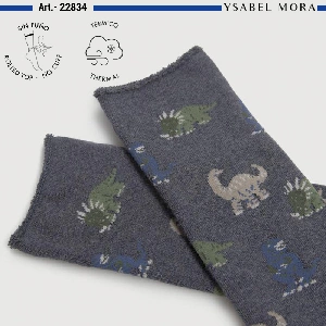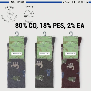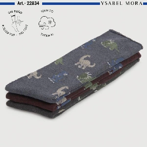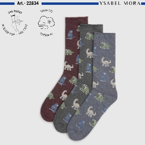 Calcetín hombre Ysabel Mora 22834 Caja de 12 unidades térmicoModelo térmico de hombre tejidos en algodón y sin puño. Motivos inspirados en dinosaurios sobre bases lisas. Su interior térmico los convierte en el accesorio perfecto para los días más fríos. Diseños cómodos y de tendencia.Presentación: Caja de 12 unidadesColores: surtidoTallas: 41-46Composición: 80% Algodón, 18% Poliéster, 2% Elastano