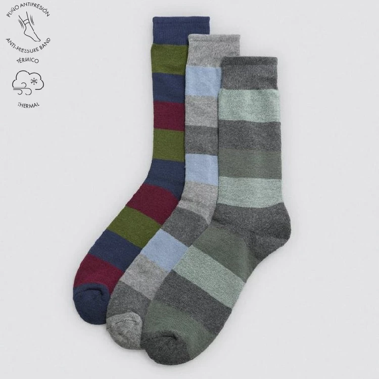 Calcetín hombre Ysabel Mora 22949 Pack de 12Modelo largo térmico con estampado de rayas con puño antipresión.Presentación: Caja de 12 unidadesColor: SurtidoTallas: 36-41Composición: 80% Algodón, 18% Poliéster y 2% Elastano