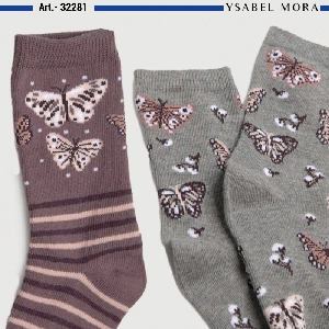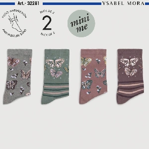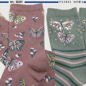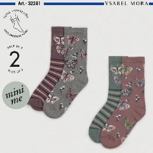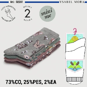 Calcetín infantil niña Ysabel Mora 32281 Otoño-invierno 6 Packs de 2 puño antipresiónModelo para niña tejidos en algodón. Diseños con mariposas en colores suaves con puño especial antipresión.Presentación: Caja de 6 pakcs de 2Tallas: 4 (26-28), 6 (29-31), 8 (32-34), 10 (35-37) y 12 (38-40)Colores: SurtidoComposición: 73% Algodón, 25% Poliéster, 2% Elastano