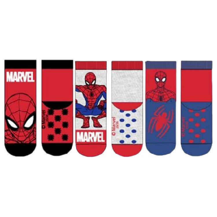 Calcetín infantil Spiderman HY06065 Pack de 12 AntideslizanteModelo antideslizante estampado completo de Spiderman.Presentación: Pack de 12 unidades, con 3 estampados diferentesColor: Surtido (Cuenta con 3 estampados diferentes)Tallas: Surtido (3 de la talla 23/26, 6 de la 27/30 y 3 de la 31/34)Composición: 70% Algodón, 18% Poliéster, 10% Poliamida y 2% elastano