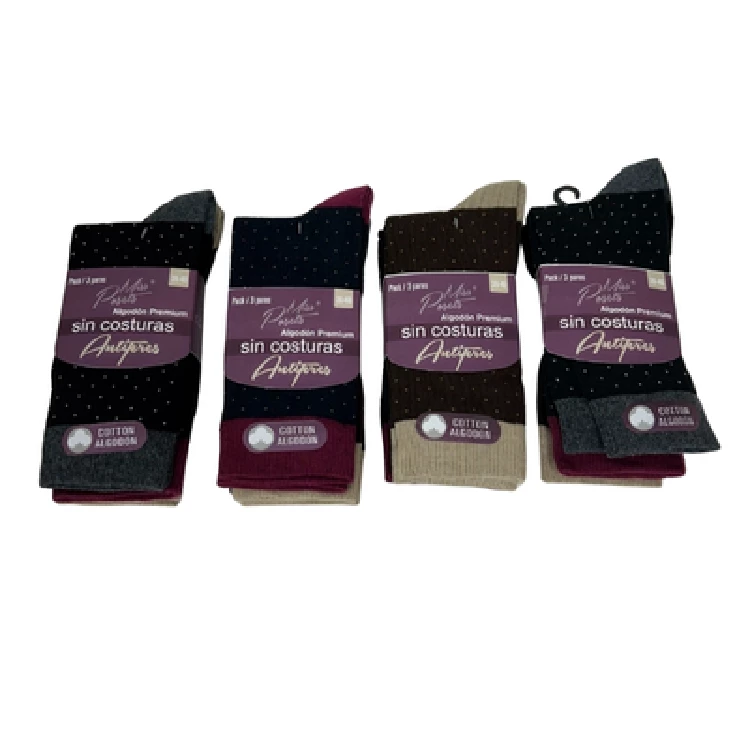 Calcetín mujer Posets 3426 4 TripacksModelo largo sin costuras, hecho de algodón Premium, con puño antipresion y estampado completo.Presentación: Bolsa de 4 tripacks surtidosColor: SurtidoTallas: 36/40Composición: 80% Algodón, 18% poliéster y 2% elastanoCUIDADOS:Lavar a 30ºNo utilizar blanqueantesNo utilizar secadoraNo plancharNo lavar en seco
