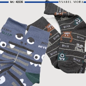 Calcetín niño Ysabel Mora 42235 Otoño-invierno 6 packs de 2 puño antipresiónModelo para niño tejidos en algodón. Diseños monstruosos en colores oscuros con puño antipresión.Presentación: Caja de 6 packs de 2Tallas: 4 (26-28), 6 (29-31), 8 (32-34), 10 (35-37) y 12 (38-40)Colores: SurtidoComposición: 73% Algodón, 25% Poliéster, 2% Elastano