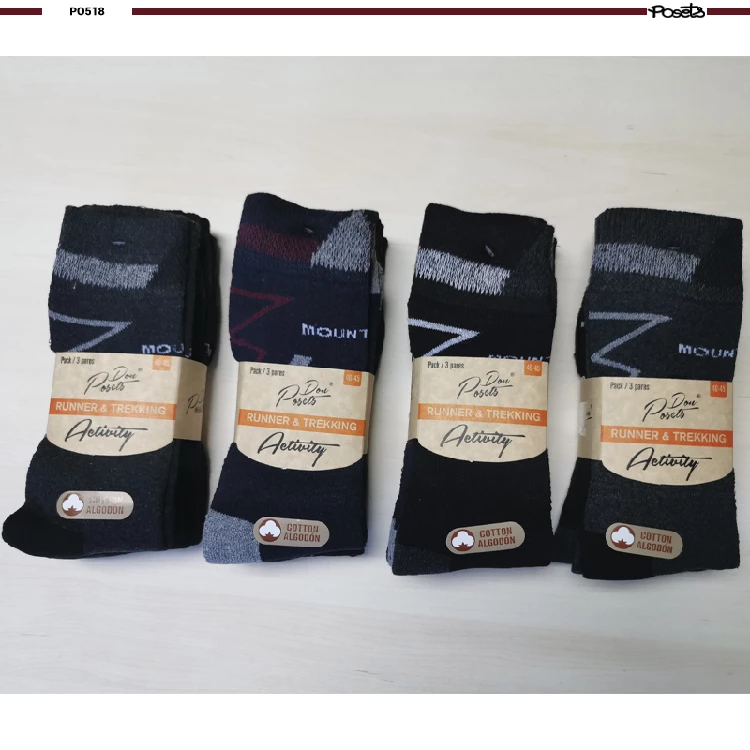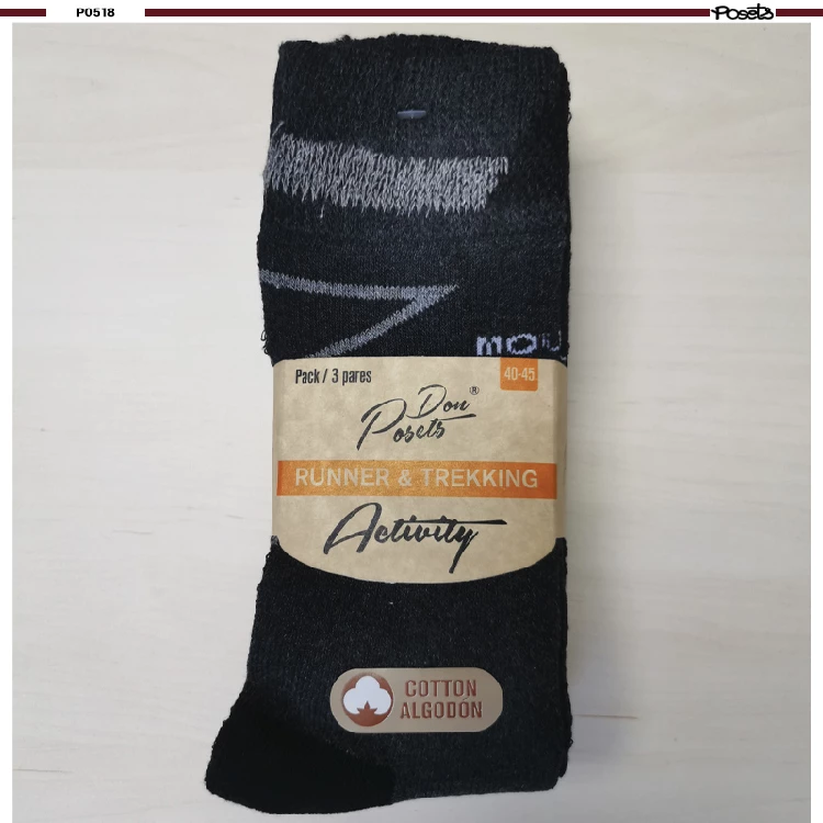 Calcetines hombre Posets PO518 Pack de 12 en pack de 3Modelo largo de algodón, para hacer running y trekking y estampadoPresentación: Bolsa de 12 unidades en pack de 3Tallas: 40/45Colores: SurtidoComposición: 80% Algodón, 18% poliéster y 2% elastano