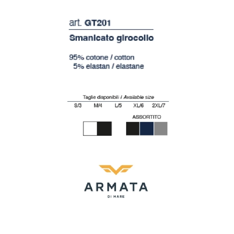 Camiseta hombre Armata di Mare GT201 DesmangadoModelo desmangado y cuello redondo básico, hecho de algodón.Presentación: Caja individual de la marcaColor: Negro y BlancoTallas: S, M, L, XL y XXLComposición: 95% Algodón y 5% elastano