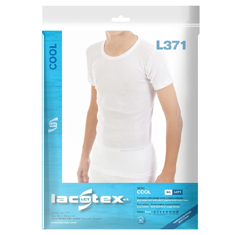 Camiseta infantil niño manga corta Lacotex LCT371Camiseta interior de niño con manga corta y cuello redondo. Fabricada en algodón y poliéster, con punto inglés, es una prenda de ropa interior cómoda y fresca para usar debajo de la ropa. El cuello redondo es un cuello de forma circular, que permite una mayor movilidad en el cuello. El punto inglés es un tipo de tejido con un patrón de pequeñas rayas que se cree que es más duradero y resistente a las arrugas.La mezcla de algodón y poliéster proporciona una combinación de suavidad y frescura, mientras que el poliéster le da resistencia y durabilidad. El uso de punto inglés puede proporcionar una mejor ventilación y transpiración, lo que contribuye a que se enfríe cuando se usa.Presentación: Bolsa de la marcaColor: BlancoTallas: 2, 4, 6, 8, 10, 12, 14 y 16Composición: 60% algodón y 40% poliésterPrecio por 1 Unidad