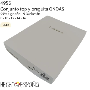 Conjunto niña comunión Calamaro 04956 OndasEs un conjunto de 2 piezas formado por un top y una braga.Top de tirante fino con encaje en todo el modelo.Braguita midi coordinada y con encaje.Presentación: Caja individual con ventanaColor: crudoTallas: 8, 10, 12, 14 y 16 Composición: 95% algodón y 5% elastáno