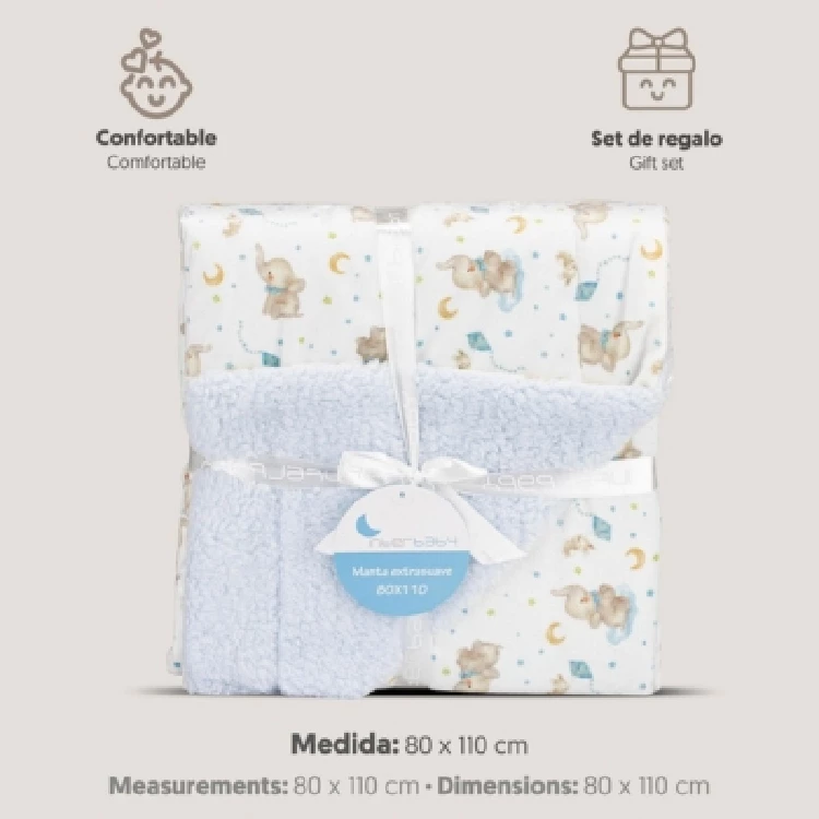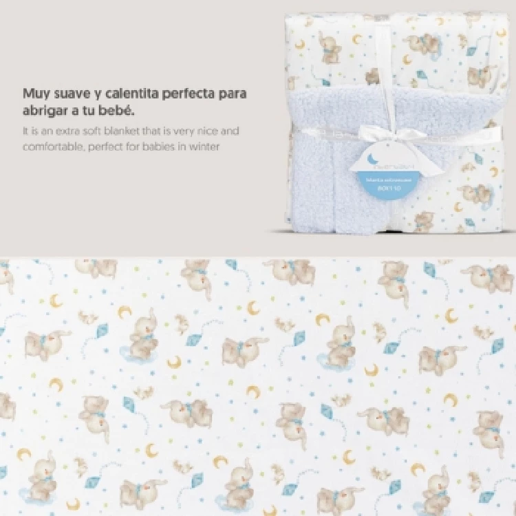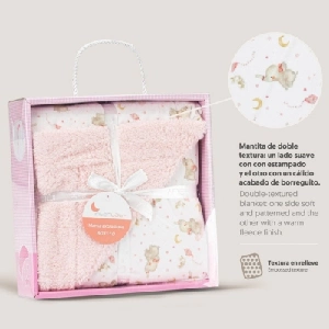 Manta bebe Interbaby 920Modelo extra suave de sherpa, con estampado de elefantesPresentación: Caja individual con asaColor: Rosa y AzulTallas: Única (80x110 cm)Composición: 100% Poliéster