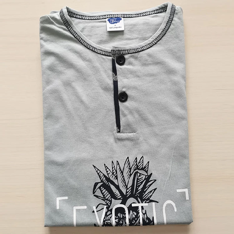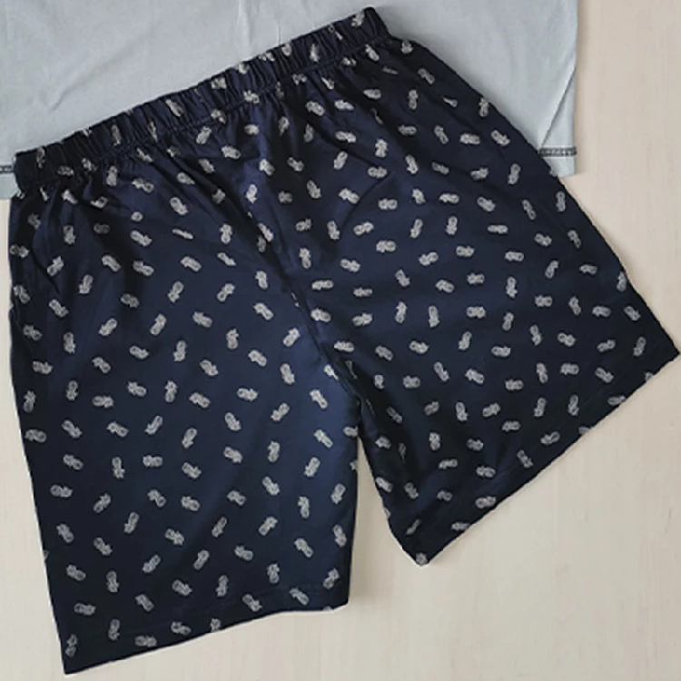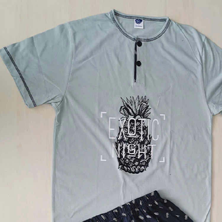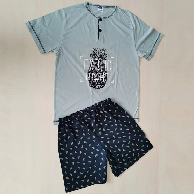 Pijama de hombre Lacotex LCT2026C Primavera-VeranoCamiseta verde agua de manga corta y cuello de tapeta con estampado posicional en el pecho,Pantalón corto marino estampado completo piñasPresentación: bolsa individualColor: ÚnicoTallas: S, M, L, XL, XXLComposición: Punto liso 100% algodón