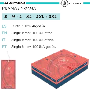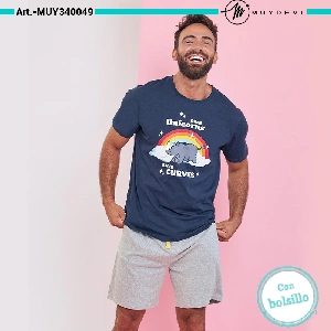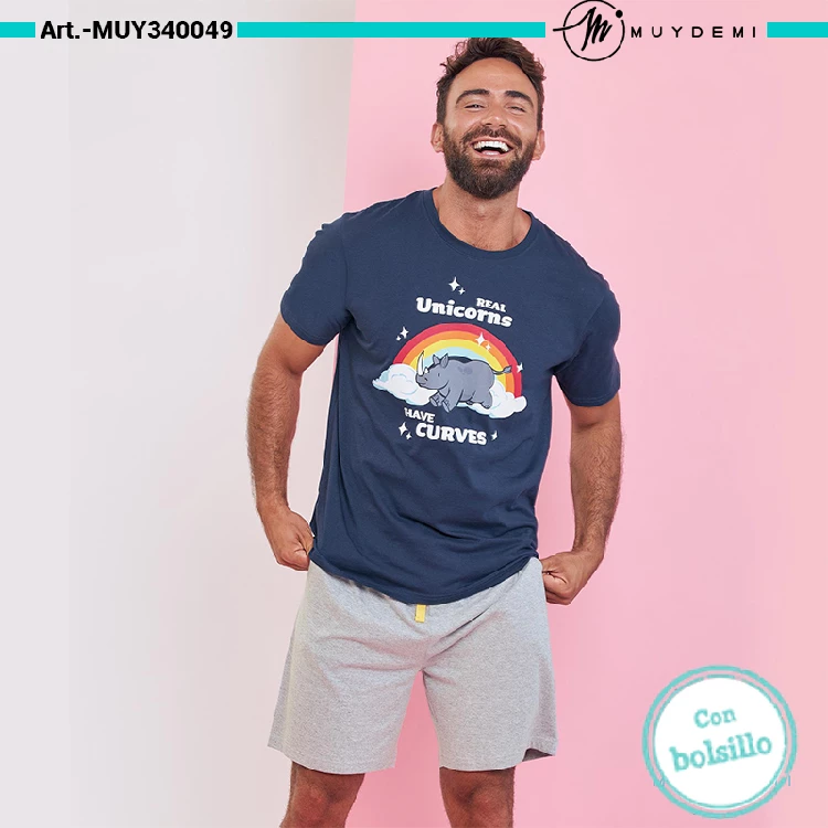 Pijama de hombre Muydemi 340049 punto liso primavera-veranoCamiseta de manga corta, con cuello redondo y con estampado en el pecho.Pantalón corto liso con cordón y con bolsillos.Presentación: caja individual de la marca.Color: Único Tallas: S, M, L, XL, XXL y 3XLComposición: Algodón 100%.