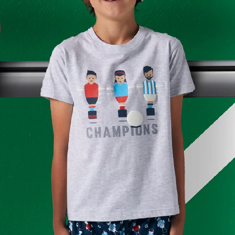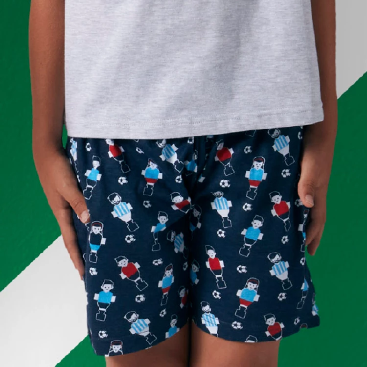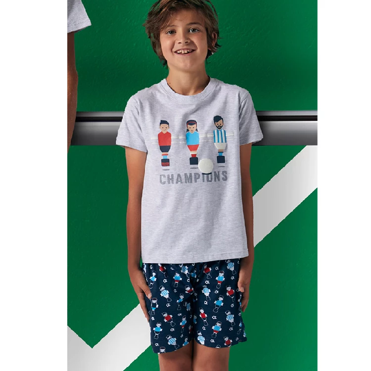 Pijama de niño Diver 55636 de punto vigore primavera-veranoCamiseta manga corta, con cuello redondo y estampado en el pechoPantalón corto con estampado coordinados y con bolsillos.Presentación en caja individual de la licencia.Color: Gris jaspeTallas: 6, 8, 10, 12, 14 y 16Composición: 98% algodón y 2% poliésterCombinan: 56554 y 55636