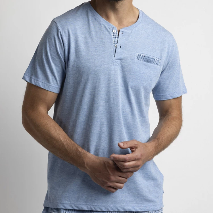 Pijama hombre Admas 64764 Punto VigoréCamiseta de manga corta y cuello tapeta con 2 botones, bolsillos en el pecho.Pantalón corto estampado completo con bolsillo en los laterales.Presentación: Caja individual con caja personalizadaColor: Azul Tallas: M, L, XL y XXLComposición: 50% Algodón y 50% Viscosa