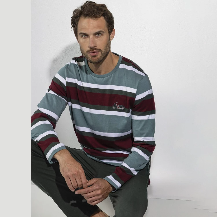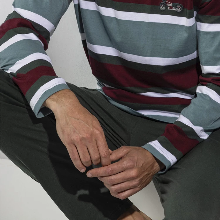Pijama hombre Admas 64797 PuntoCamiseta de manga larga y cuello redondo con estampado completo a rayas y bordado en el pecho.Pantalón largo básico.Presentación: Caja individual con caja personalizadaColor: VerdeTallas: S, M, L, XL y XXLComposición: 100% Algodón