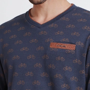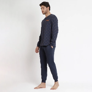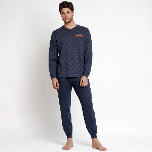 Pijama hombre Antonio Miro 62184 InterlockCamiseta de manga larga y cuello de pico, estampado completo. Manga con puño.Pantalón largo básico con bolsillos y puño.Presentación: Caja individual de la marcaColor: MarinoTallas: S, M, L, XL y XXLComposición: 100% algodón