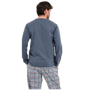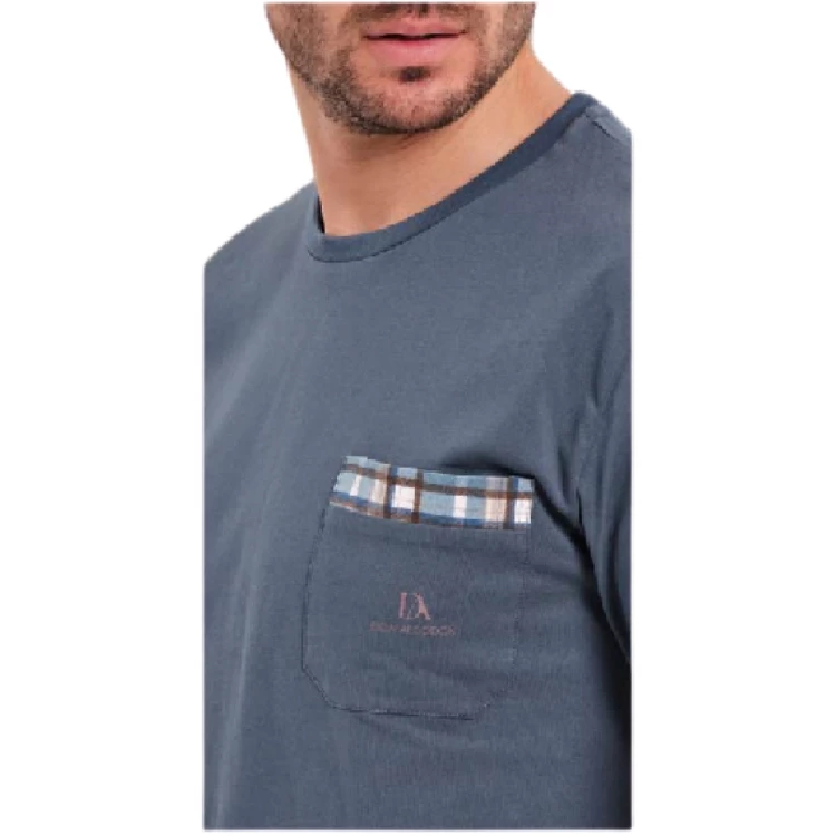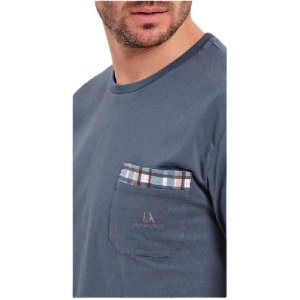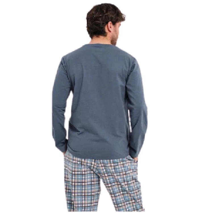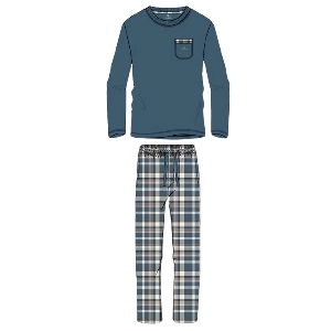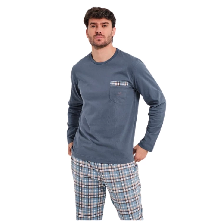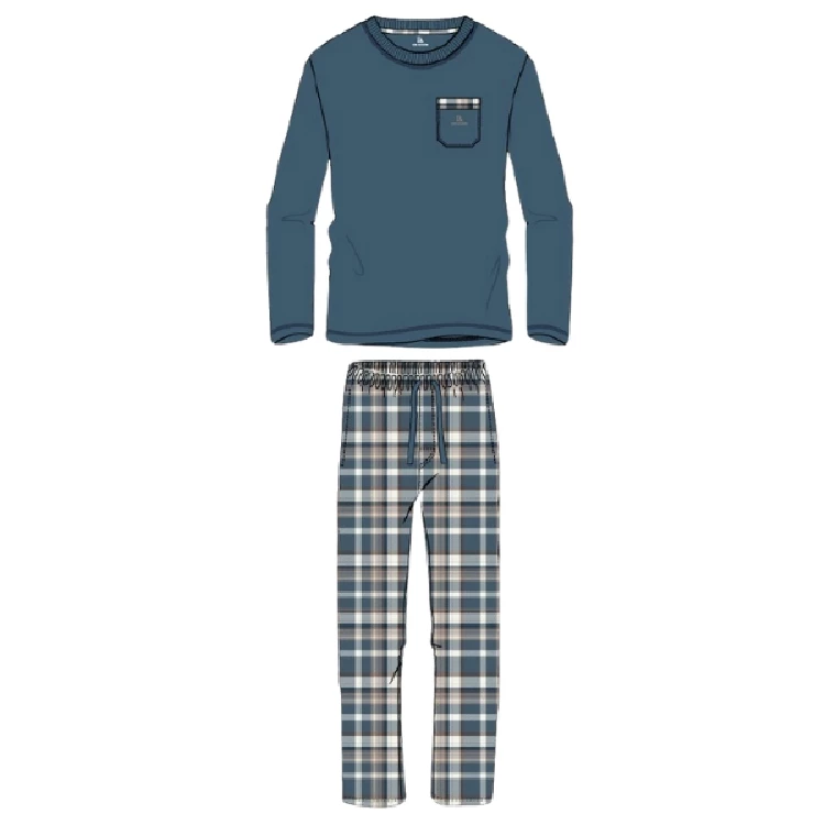 Pijama hombre Don algodón DA25W302 interlockCamiseta de manga larga y cuello redondo con estampado lateral en el pecho y bolsillo.Pantalón largo estampado a cuadros sin puños.Presentación: Caja individual personalizada de la marcaColor: AzulTallas: S, M, L, XL, XXL,Composición: Interlock 100% algodón