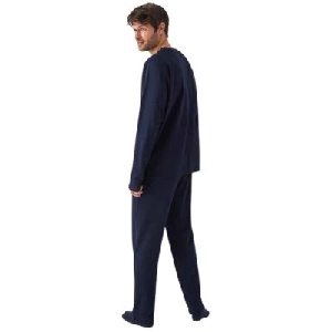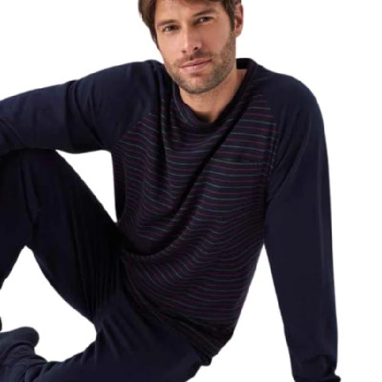 Pijama hombre Feelfree H34542 Punto MilanoCamiseta de manga larga y cuello redondo con estampado en la parte frontal.Pantalón largo básico.Presentación: Caja individualColor: MarinoTallas: S, M, L, XL y XXLComposición: Tejido Punto Milano