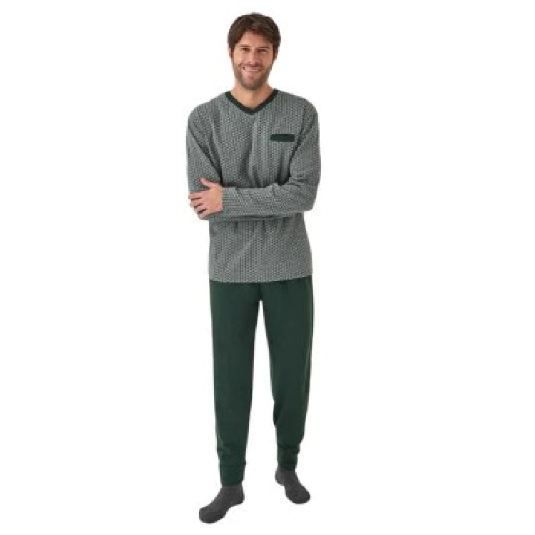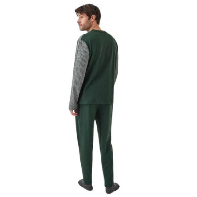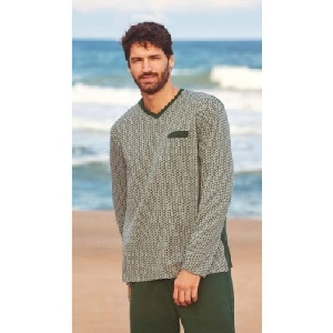 Pijama hombre Feelfree H34552 Punto MilanoCamiseta de manga larga y cuello pico con estampado en la parte frontal y bolsillo en el pecho.Pantalón largo básico con puñoPresentación: Caja individualColor: VerdeTallas: S, M, L, XL y XXLComposición: Tejido Punto Milano