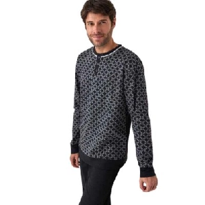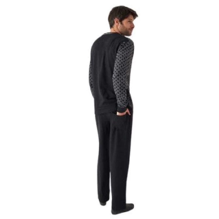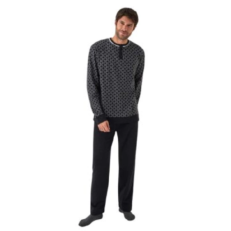 Pijama hombre Feelfree H34562 Punto MilanoCamiseta de manga larga y cuelo abotonado con estampado en la parte frontal y manga con puño.Pantalón largo básico con bolsillo trasero.Presentación: Caja individualColor: GrisTallas: S, M, L, XL y XXLComposición: Tejido Punto Milano