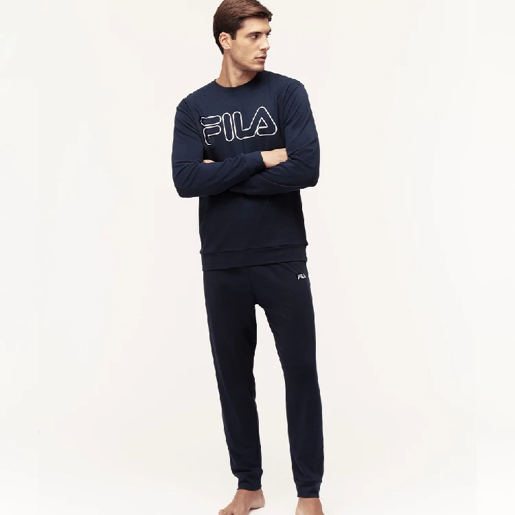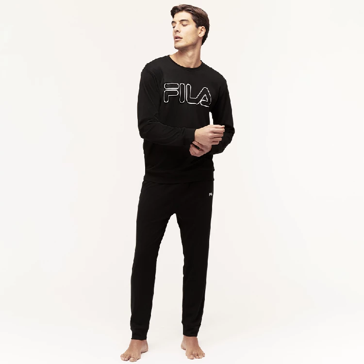 Pijama hombre Fila FPW1235Camiseta de manga larga y cuello redondo, manga con puño y estampado en el pecho de la marca.Pantalón largo básico, con bordado de la marca y puño.Presentación: Caja individual de la marcaColor: Negro y marinoTallas: S, M, L, XL y XXLComposición: 100% Algodón