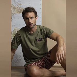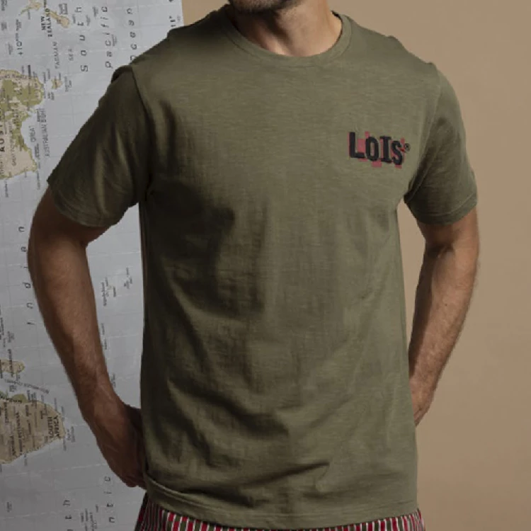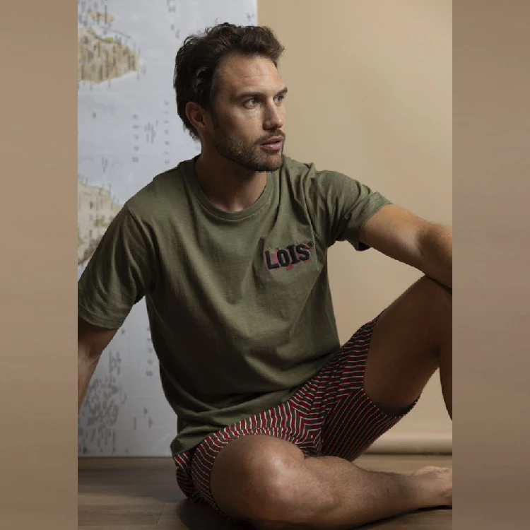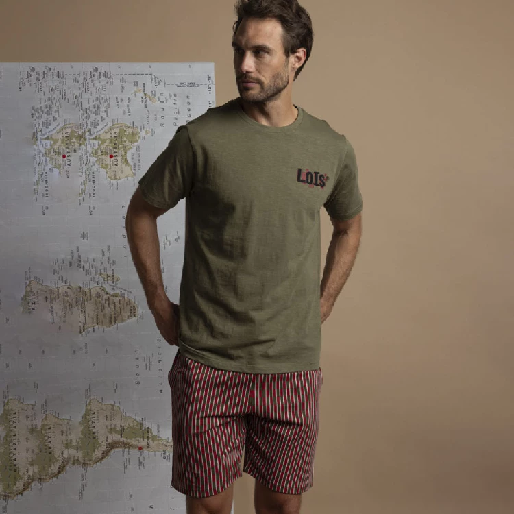 Pijama hombre Lois 64143 PuntoCamiseta de manga corta y cuello redondo con bordado en el pecho.Pantalón corto estampado completo con bolsillos en los laterales.Presentación: Caja individual con caja personalizadaColor: CaquiTallas: M, L, XL y XXLComposición: 100% Algodón