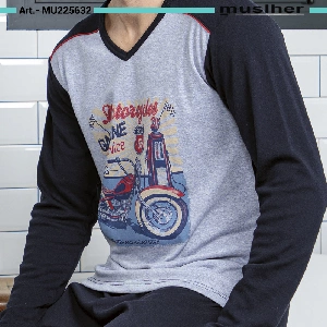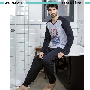 Pijama hombre Muslher 225632 Otoño-invierno interlock perchadoCamiseta de manga larga y cuello pico con estampado en el pecho.Pantalón largo liso con puñoPresentación: caja individual de la marca con ventana.Color: ÚnicoTallas: S, M, L, XL y XXLComposición: 50% algodón y 50% poliéster