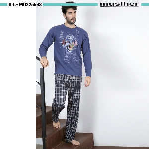 Pijama hombre Muslher 225633 Otoño-invierno interlock perchadoCamiseta de manga larga y cuello redondo con estampado en el pecho.Pantalón largo estampado completoPresentación: caja individual de la marca con ventana.Color: ÚnicoTallas: S, M, L, XL y XXLComposición: 50% algodón y 50% poliéster