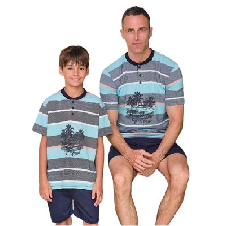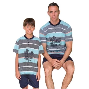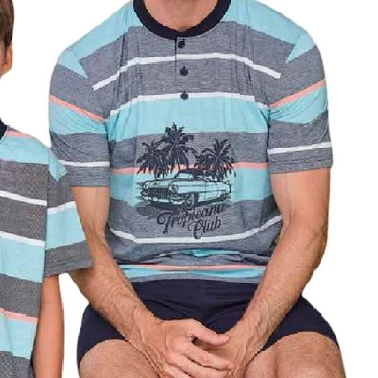 Pijama hombre Muslher 265016 Punto lisoCamiseta de manga corta y cuello tapeta, con estampado completo.Pantalón corto básico.Presentación: Caja individualColor: ÚnicoTallas: S, M, L, XL y XXLComposición: 100% Algodón