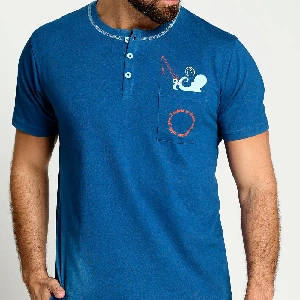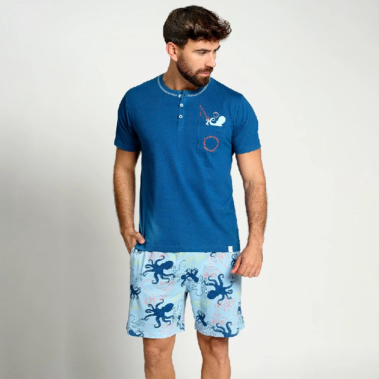 Pijama hombre MuyDemi 13071090 Camiseta de manga corta con cuello henley y 3 botones. Estampado de pulpo y caña de pescar en el bolsillo.Pantalón corto con estampado, bolsillos laterales y cintura elástica. Presentación: Packaging individual de la marcaColor: ÚnicoTallas: S, M, L, XL y XXLComposición: 100% AlgodónCombinan: 17071020 y 13071090