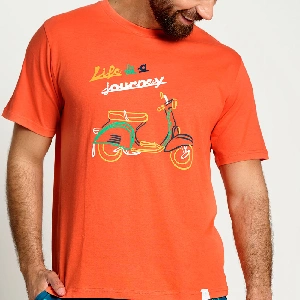 Pijama hombre Muydemi 13071109Camiseta de manga corta, cuello redondo, color naranja con estampado de una Vespa retro que dice "Life is a Journey". Pantalón corto con estampado repetido de la misma Vespa y bolsillos laterales. Presentación: Bolsa individual de la marcaColor: ÚnicoTallas: S, M, L, XL y XXLComposición: 100% AlgodónCombinan: 13071109 y 17011025