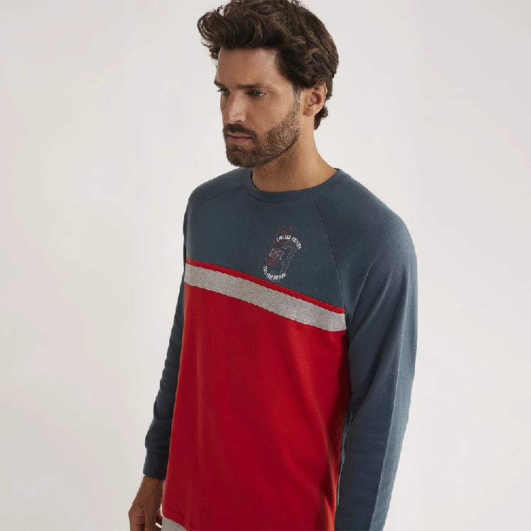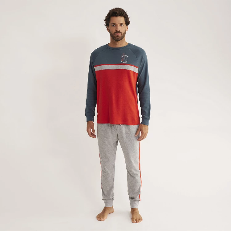 Pijama hombre Promise H33472 InterlockCamiseta de manga larga y cuello redondo y con estampado en el pecho. Manga con puño.Pantalón largo con vivo y puño.Presentación: Caja individual de la marcaColor: RojoTallas: S, M, L, XL y XXLComposición: 100% Algodón